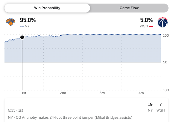 With 6:35 remaining in the first quarter, OG Anunoby hit a 3-pointer to make it 19-7, giving the Knicks a double digit lead that they would never relinquish. According to ESPN’s win probability tracker, that basket upped New York’s odds for victory to 95.0 percent. Those odds would not drop below 95.0 percent for the remainder of the evening.