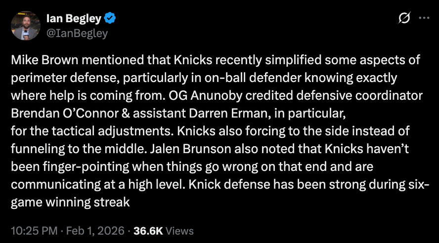 In that sense, toppling LeBron at the Garden for the first time since Mario Hezonja briefly became Super Mario was eminently appropriate. For all of their top end talent, the Lakers have consistently failed to defend under JJ Redick. Brown, for whatever ups and downs he’s had, has his group playing their best basketball just in time for the home stretch.