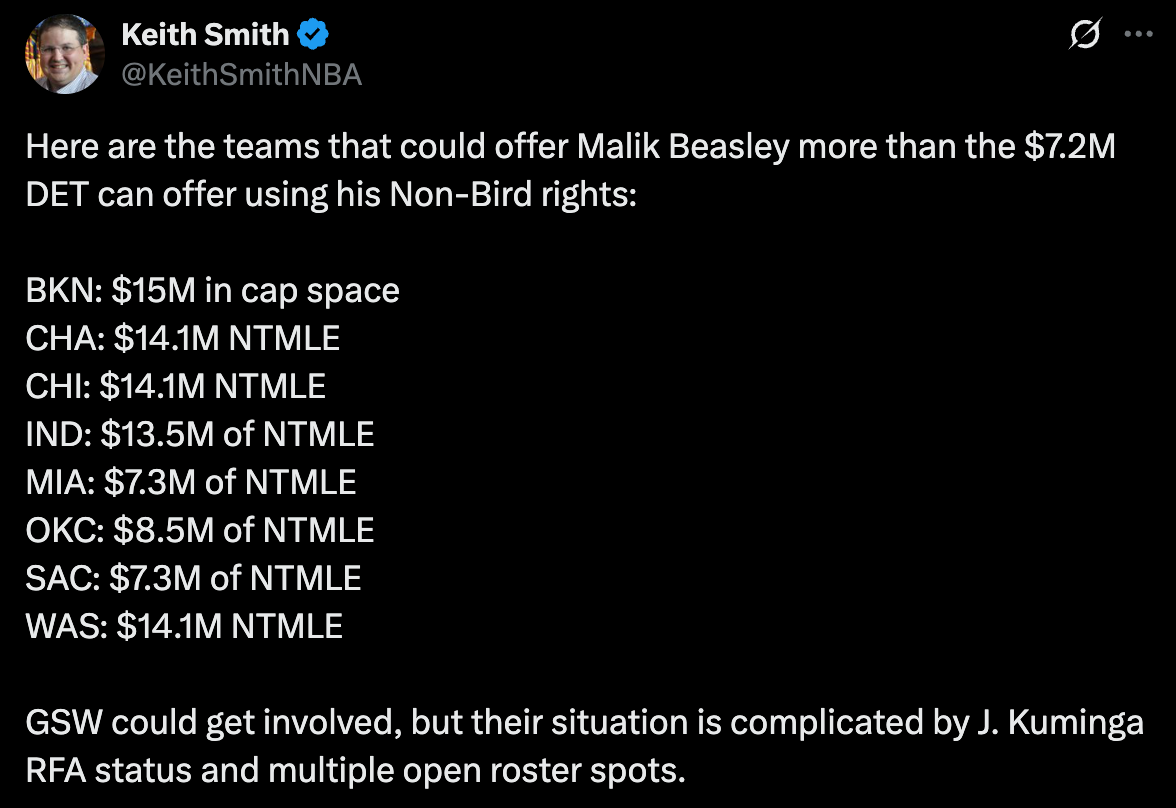 Before that investigation, Beasley was set to sign a three-year, $42 million contract to remain in Detroit, but they no longer have the ability to offer him nearly as much and have stocked their roster with other pieces. Still, several teams (the Pistons included) have the ability to offer Beasley much more than the veteran exception the Knicks are limited to giving, as Keith Smith details here: