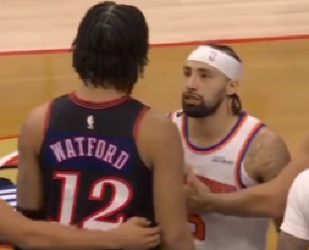 That’s when Mitchell Robinson, following an offensive rebound on a Jose Alvarado missed three, turned to put the ball on the floor and drove hard along the baseline. When Mitch rose for a dunk on the same court Embiid once dragged him down by the legs, Trendon Watford committed a hard foul that had a little extra on the back end. With Robinson on the ground and Alvarado and Hart rushing to his side, Watford felt little impetus to remove himself from the area.