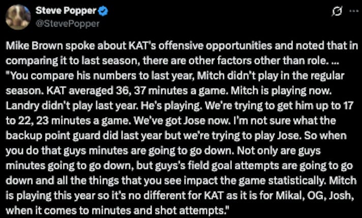 Yes, everyone’s minutes are down, and several players’ shot attempts are down as a result of that, but on a per-36 minute basis, Towns is taking an average of 1.3 fewer shots compared to 0.8 fewer for Mikal, 0.4 fewer for OG and 1.2 more for Hart. Those last three numbers net out to even. The reality is that the biggest reason for KAT’s drop in shot attempts isn’t attributable to someone like Landry (0.6 more per 36) or Mitch (5.7 shots per 36, a steep drop from the 10.1 taken by the man he effectively replaced, Precious Achiuwa), but Jalen Brunson, who is up 2.4 shots per 36. Effectively, KAT’s loss has been Brunson’s gain. When you factor in the minutes (Brunson playing 0.7 fewer minutes per game compared to 3.6 fewer for Towns), the discrepancy only gets more severe.
