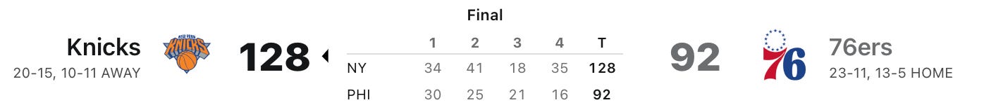 Game 35: Knicks 128, Sixers 92