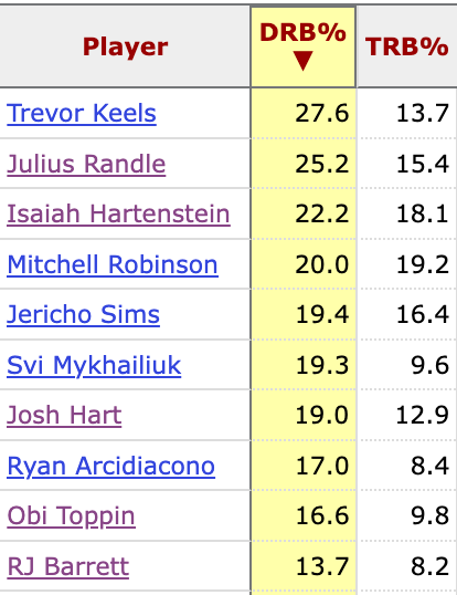 On the plus side, swapping out Obi for Hart/RJ makes the Knicks more switchable and doesn’t hurt their rebounding much if at all. Here’s New York’s leaders in defensive rebounding rate last season, with their total rebounding rate listed alongside: