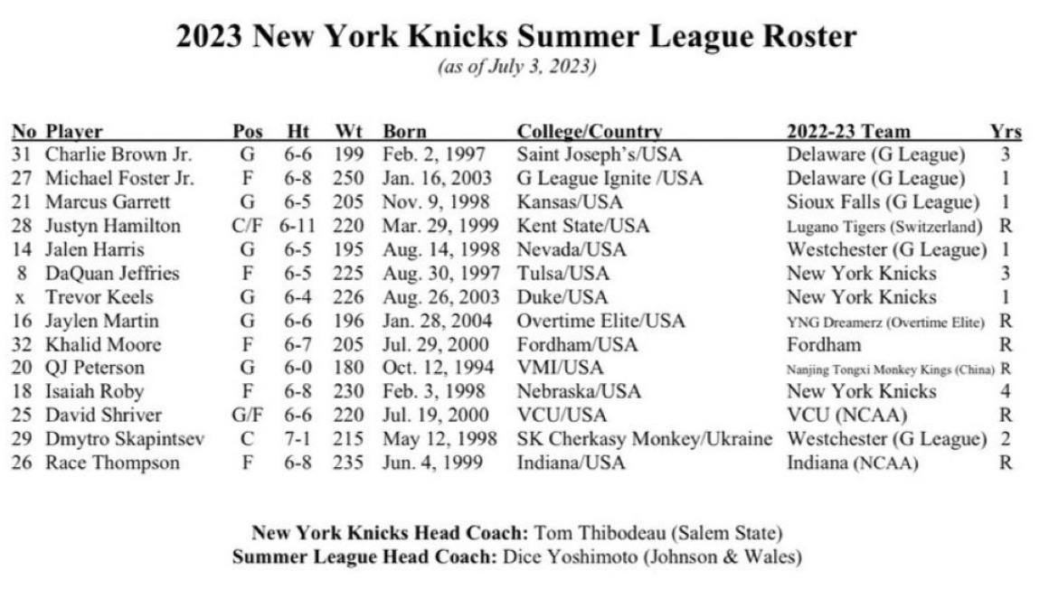 🏀 The Knicks released their summer league roster ahead of Saturday’s opening game (5pm, NBATV vs Philly), and it’s notably low on brand name players in comparison to past years: