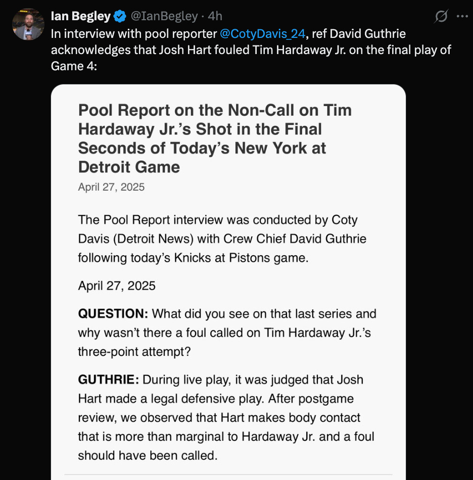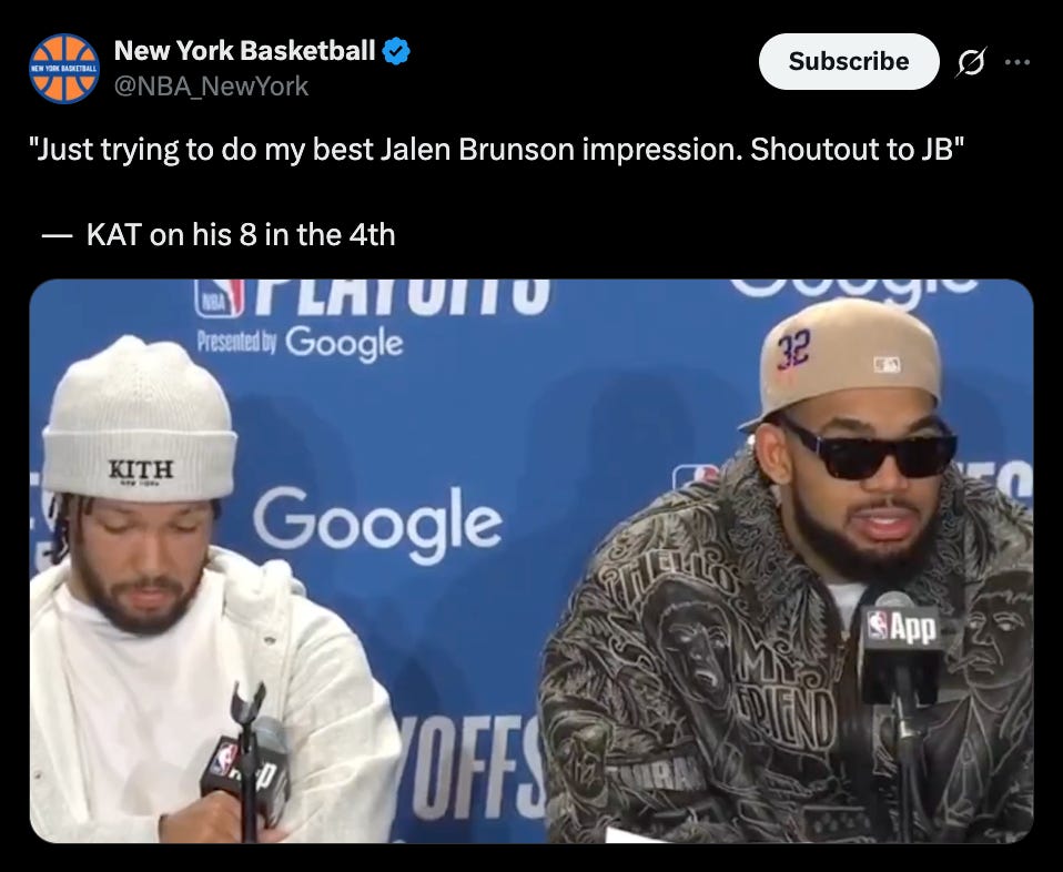 That move from KAT, shaking his man as he fades into the corner and shooting over and behind the backboard is a NYC playground moment. The pass from OG between three defenders in order to get KAT the ball, along with the initial contact from Duren that cutoff KATs attempt to put the ball on the floor which led to the step back three is the what makes this team so freaking unpredictable. Brunson has proven himself as the best player in this series, hands down. Detroit, a team that prides itself on being physical, complaining about a non call on the final play of a game is priceless.