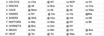 Even more than that uncertainty, the real intrigue lies on the other end of the bracket. Going into play on Sunday, the only certainty from spots 5 through 10 was that the Hawks could not finish tenth. We got a bit more certainty with yesterday’s results, but with just seven days left, there are no less than six potential first round playoff opponents for the Knicks. Given how often these teams play each other in the final week, even trying to speculate about potential matchups seems fraught: