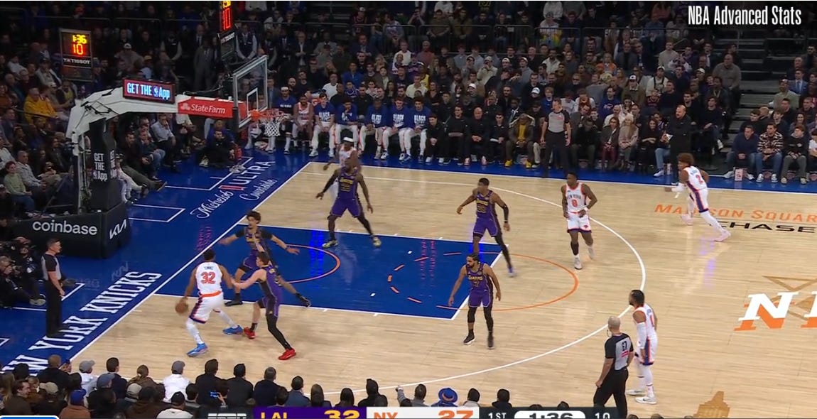 One note before we get to today’s newsletter: it’s going to focus purely on the offensive end. New York’s defense - and KAT’s defense in particular - was dreadful on Saturday night. My read, given that multiple schemes fell flat on their face and no one was as attentive or engaged as they needed to be, is that the old “play better” adjustment would have gone a long way here. The offense is far more interesting to me, which is where I’m focusing today.